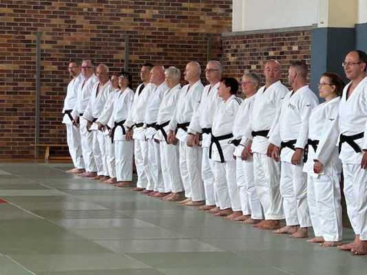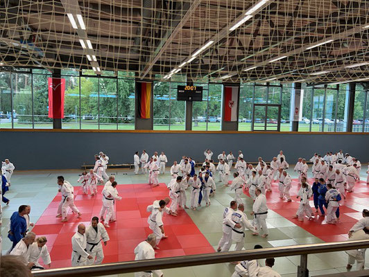 Neben dem Techniktraining standen für die zahlreichen Dan-Trägerinnen und -Träger auch Kata-Einheiten und Prüfungsvorbereitungen auf dem Programm. Insgesamt 50 Judoka meldeten sich hierfür an und legten am Freitag erfolgreich ihre Prüfungen ab.