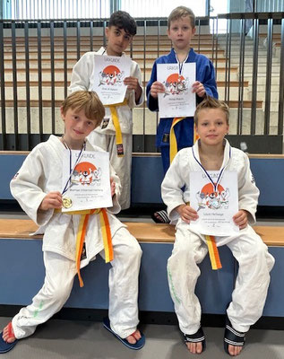 Unsere Bildergalerie von links nach rechts: die 4 siegreichen Jungs U11 – Julia v.d.Geest mit Silber - Emily als Kampfrichterin - U15 Jason und Kseniia